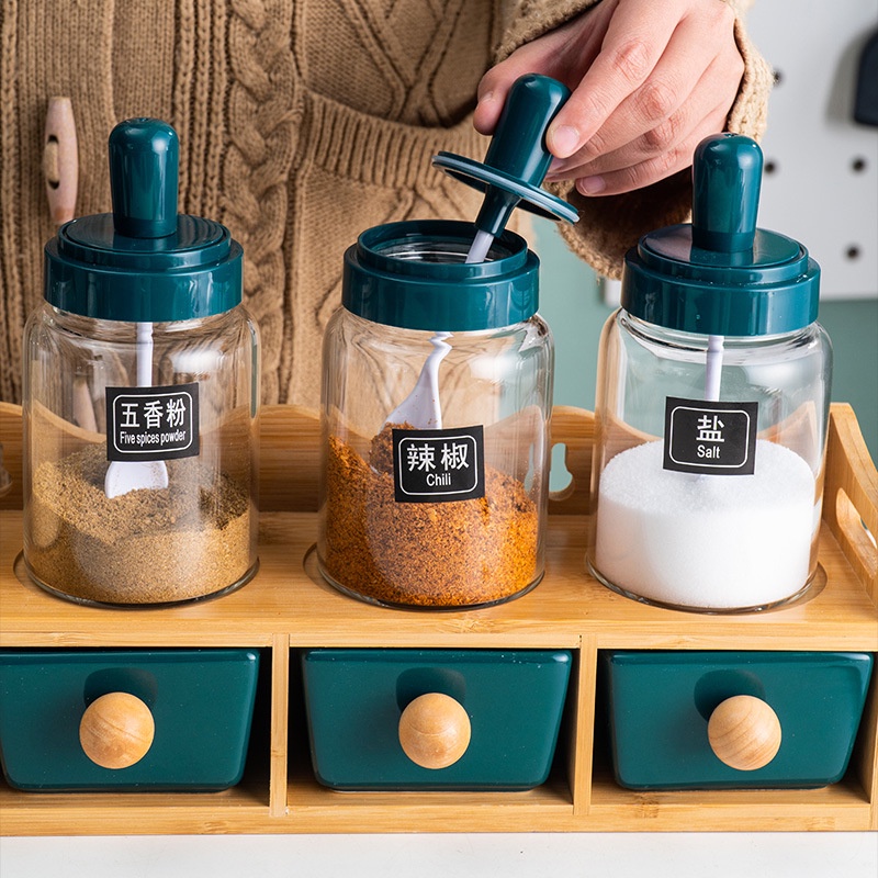 Hũ đựng gia vị thủy tinh đẹp, lọ đựng gia vị hộp tròn nhà bếp kèm thìa tiện lợi